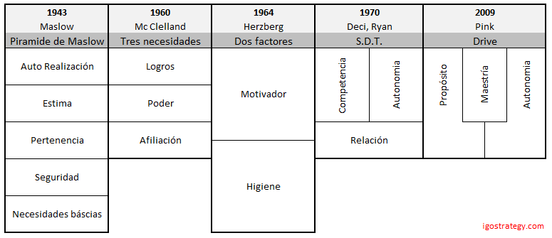A partir del 1943 cuando Maslow publicó su pirámide empiezan a interesarse muchos otros psicólogos y filósofos por la motivación: Douglas McGregor del MIT publica en 1950 su teoría X, teoría Y. En el mismo año publica David McClelland la teoría de las tres necesidades. Sigue Frederick Herzberg en 1964 con la teoría de los dos factores y en 1970 la teoría SDT (Self-determination Theory), de Edward L. Deci y Richard Ryan. De esta última se derivó en el 1974 la teoría CET (Cognitive Evaluation Theory) en la que hasta hoy se basan la mayoría de las iniciativas empresariales para aumentar la motivación. En concreto diferencia la motivación en dos conceptos: