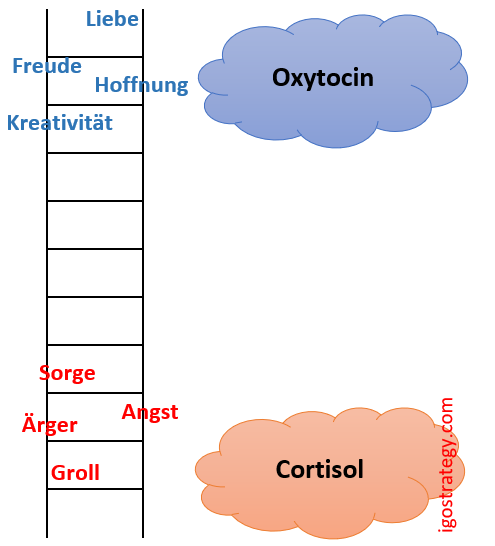 Ganz unten auf der Leiter befinden sich negative Gefühle wie Sorgen, Ängste, Stress, Wut oder Verbitterung. Wenn man diese verspürt, sendet der Hypothalamus, ein Teil unseres Gehirns, den Befehl, Kortison auszuschütten – ein Hormon, das uns auf den Kampf vorbereitet: Angreifen oder Fliehen. Wann ist das wünschenswert? Es ist ein negativer Zustand, der sogar gesundheitsschädigend sein kann, wenn er länger andauert. Deshalb ist er nur für kurze Zeitspannen zu empfehlen, beispielsweise wenn eine sehr knappe Deadline ansteht. Damit das klappen kann, müssen alle notwendigen Aufgaben einfach und klar definiert sein. Auf gar keinen Fall können auf diese Weise komplexe Probleme angegangen oder Kreativität eingefordert werden. Das Kommando „Seien Sie JETZT kreativ!“ funktioniert nicht...