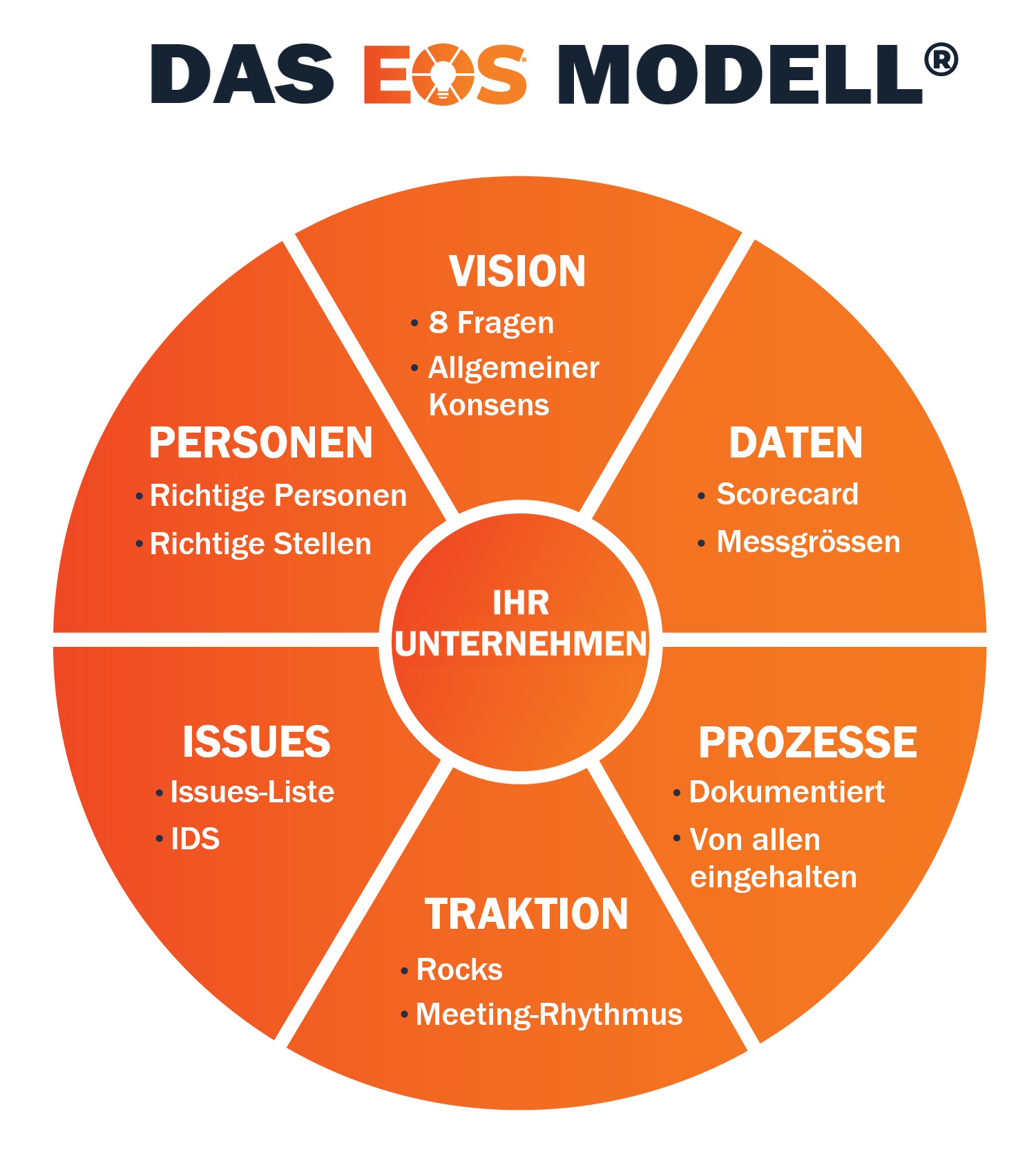 EOS ist ein einfaches, aber extrem wirkungsvolles System, das zehntausende Leadership-Teams weltweit nutzen. Der Fokus liegt auf sechs Schlüsselbereichen: